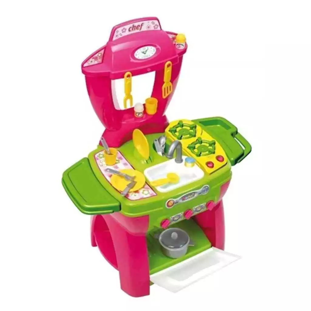 -Posee múltiples funciones, que les permitirán a los chicos sentir que están cocinando de verdad, porque el horno tiene luces que se encienden de verdad, al encender las hornallas se escucha el sonido del agua hirviendo o fritura en sartén, y hasta pueden lavar la vajilla con agua de verdad en el lavaplatos.